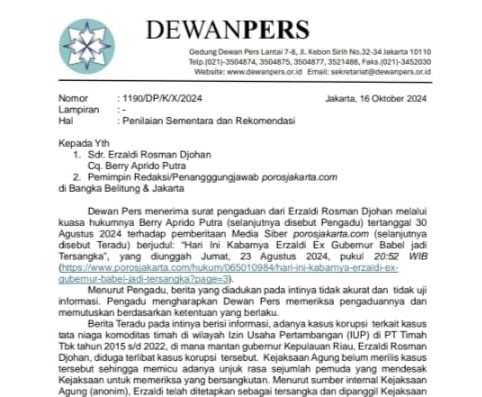 Dewan Pers dalam surat bernomor 1190/DP/K/X/2024 Jakarta, 16 Oktober 2024 yang