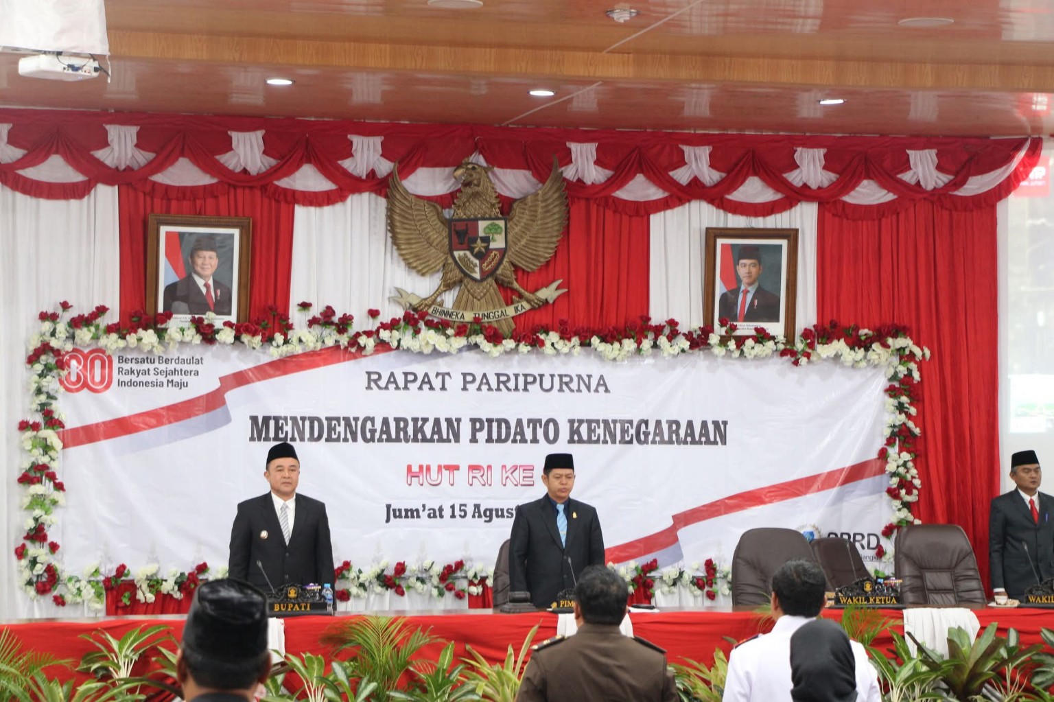Mengusung tema “Bersatu, Berdaulat, Rakyat Sejahtera, Indonesia Maju”, rapat dipimpin Wakil Ketua I DPRD Bangka Hendra Yunus, SE, dan dihadiri Pj Bupati Bangka Jantani Ali, ST, jajaran Forkopimda, perwakilan BIN, Plt Sekda, para asisten, kepala dinas, camat, lurah, organisasi Dharma Wanita, pasukan pengibar bendera, insan pers, serta tamu undangan lainnya.