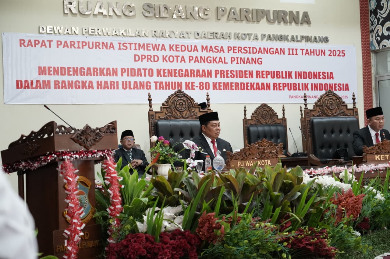 PANGKALPINANG, AksaraNewsroom.ID – DPRD Kota Pangkalpinang menggelar Rapat Paripurna Istimewa Kedua Masa Persidangan III Tahun 2025 dengan agenda mendengarkan Pidato Kenegaraan Presiden RI Prabowo Subianto, Jumat (15/8/2025) di ruang sidang paripurna.