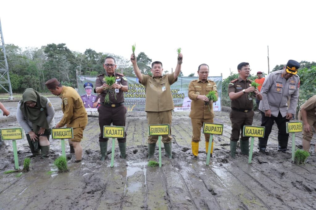 Kegiatan ini ditandai dengan penanaman padi secara simbolis oleh Gubernur bersama unsur Forkopimda, sebagai wujud dukungan nyata terhadap program “Jaksa Mandiri Pangan” di Desa Namang.